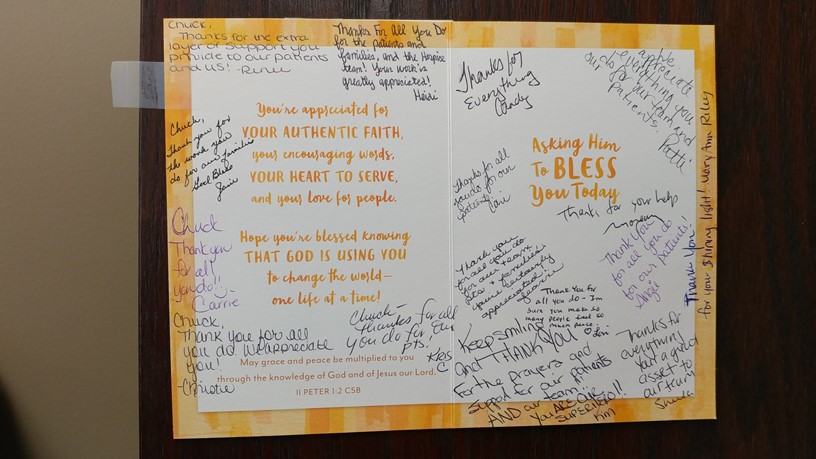 I really was touched by the personal comments on the card and by all the effort everyone went to for the moment of recognition. Today I am using my blog to issue the Hospice Team a public THANK YOU!