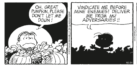 In this comic strip Linus is quoting from the Bible as people have asked God to deliver them over the centuries. Linus holds on with ferocity to what he believes. Do we hang on to what we believe with a similar ferocity? That is a question we all must answer for ourselves.